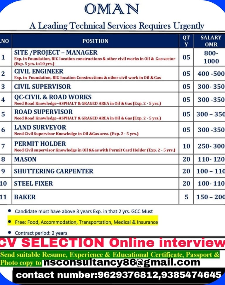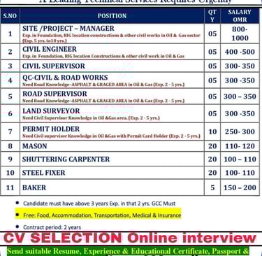 Apply now for urgent job vacancies in oman job vacancies oil and gas and construction sectors. Enjoy benefits like free food, accommodation, and medical care. CV selection and online interviews available. Don’t miss your chance to secure a rewarding position!